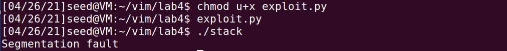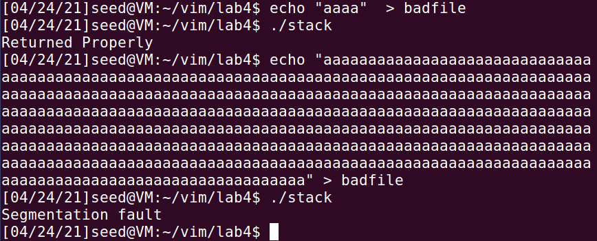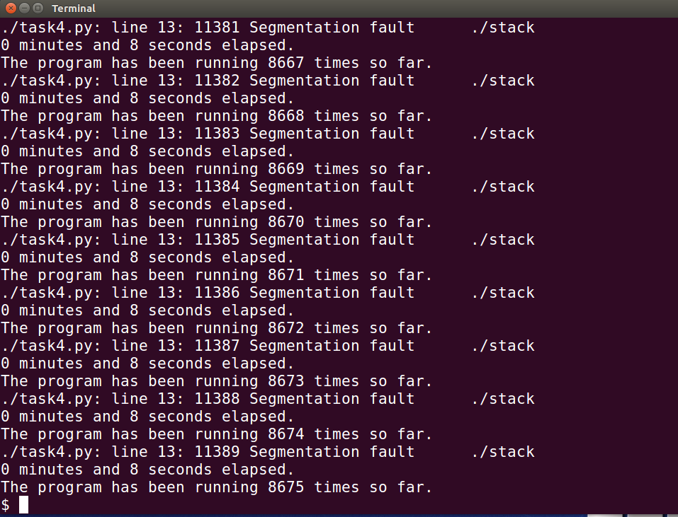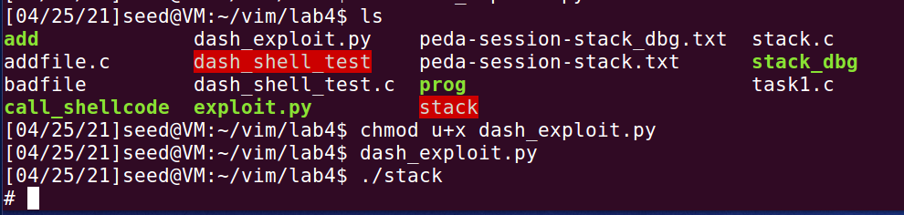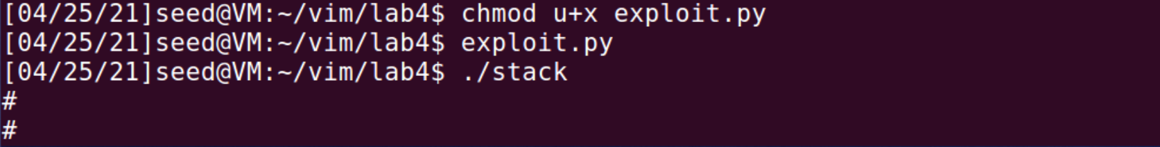 然后,我们使用暴力方法反复攻击易受攻击的程序,希望我们放入坏文件中的地址最终能够正确。您可以使用以下shell脚本在无限循环中运行易受攻击的程序。如果你的攻击成功,脚本就会停止;否则,它将继续运行。请耐心等待,因为这可能需要一段时间。如果需要,让它运行一夜。请描述你的观察。
