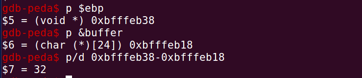 使用p指令打印帧指针的值和buffer的地址:(quit退出当前模式)