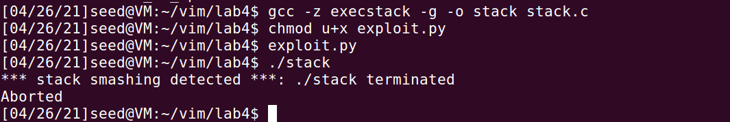 在我们以前的任务中,我们在编译程序时禁用了GCC中的堆栈保护机制。在此任务中,您可以考虑在StackGuard存在的情况下重复任务2。为此,您应该编译不带-fno-stack-protector选项的程序。对于这个任务,您将重新编译易受攻击的程序stack.c,以使用GCC StackGuard,再次执行任务1,并报告您的观察结果。您可以报告观察到的任何错误信息。