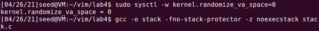 地址空间随机化。Ubuntu和其他几个基于Linux的系统使用地址空间随机化来随机化堆和栈的起始地址。这使得猜测确切的地址变得困难;猜测地址是缓冲区溢出攻击的关键步骤之一。在本实验中,我们使用以下命令禁用此功能: