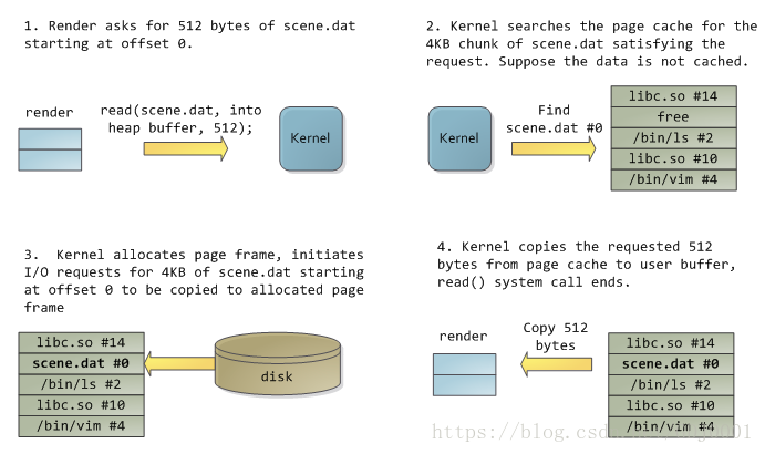 为了能够深入理解页缓存和文件IO操作之间的关系,假设系统中现在存在一个名为render的进程,该进程打开了文件scene.dat,并且每次读取其中的512B(一个扇区的大小),将读取的文件数据放入到堆分配的块中(每个进程自己的地址空间对应的物理内存)。先以普通IO为例介绍一下读取数据的过程,第一次读取的过程大致如图4