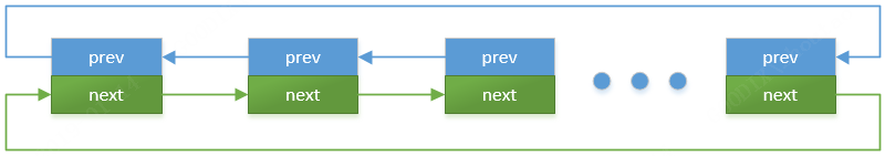 在内核链表中,仅仅定义了 next 和 prev 指针,用于寻找链表中的下一个节点和前一个节点(双向链表)。通常内核使用双向循环链表来表示。相关的数据。