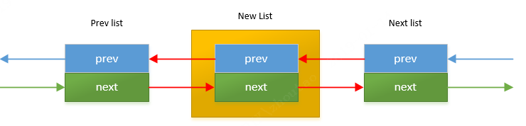 __list_add 用于在指定的 prev 和 next 之间插入一个 new 的链表