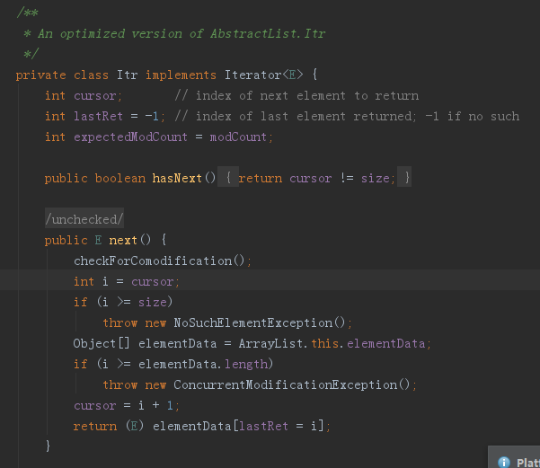 it是接口的实现类对象,调用方法 hasNext 和 next 集合元素迭代