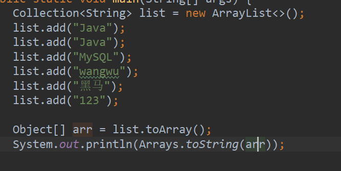 public Object[] toArray() 把集合中的元素,存储到数组中 我们一般定义一个Object[]的数组,因为集合中的元素可能有很多类型(见上图)