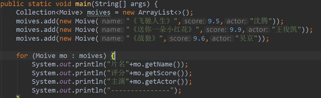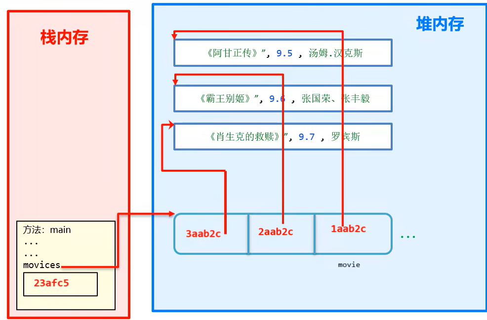 栈内存中的movies存储的是集合的地址,集合存储地址指向电影对象,增强for遍历通过mo变量来根据地址找内容