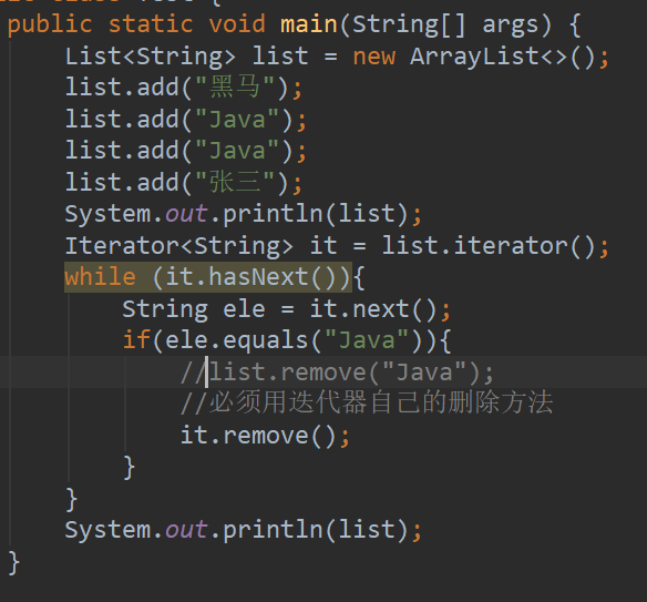 当我们从集合中找出某个元素并删除的时候可能出现一种并发修改异常问题,例如当我们要删除的元素有两个或多个时,系统会判定异常,因为会出现漏删的情况