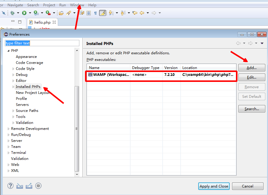 1,window-->preferences-->installed PHPs-->add,添加安装的路径添加(比如我的是:C:wamp64binphpphp7.2.10php.exe)