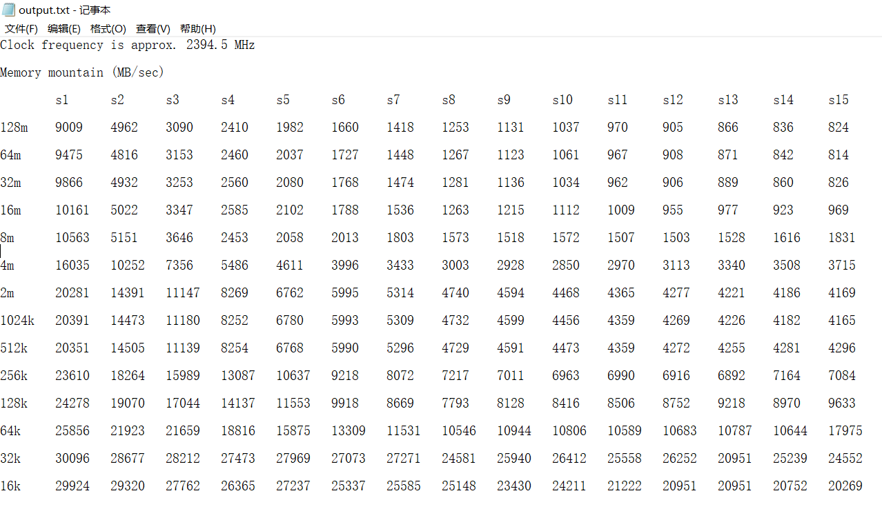 然后会得到一个可执行文件 my_memory_mountain,然后直接执行./my_memory_moutain等待一段时间之后就会得到存储器山的测量结果了。以我自己所测量的结果为例: