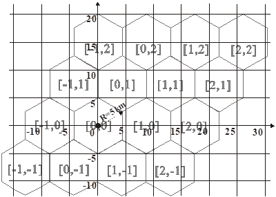 Now the question is as follows. We have a service area represented by a Euclidean plane (i.e., x−y plane). Each unit is 1 Km. For example, point (5, 0) in the plane means the location at a distance of 5 Km to the east of the origin. We assume that there are totally 400 cells, denoted by [i, j], i = −9 ... 10, j = −9 ... 10. The base station of cell [0, 0] is located at the origin of the Euclidean plane. Each cell has a radius of R = 5 Km, as shown in the following figure.