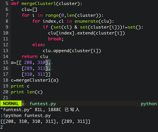 对于一个list,a=[[ 208, 310],[289, 311],[310, 311]],我的结果应该是三个子list变为一个子list,可是我写的函数当遇到这种情况的时候就没有达到我想要的结果。单步调试以下,就能发现问题所在。