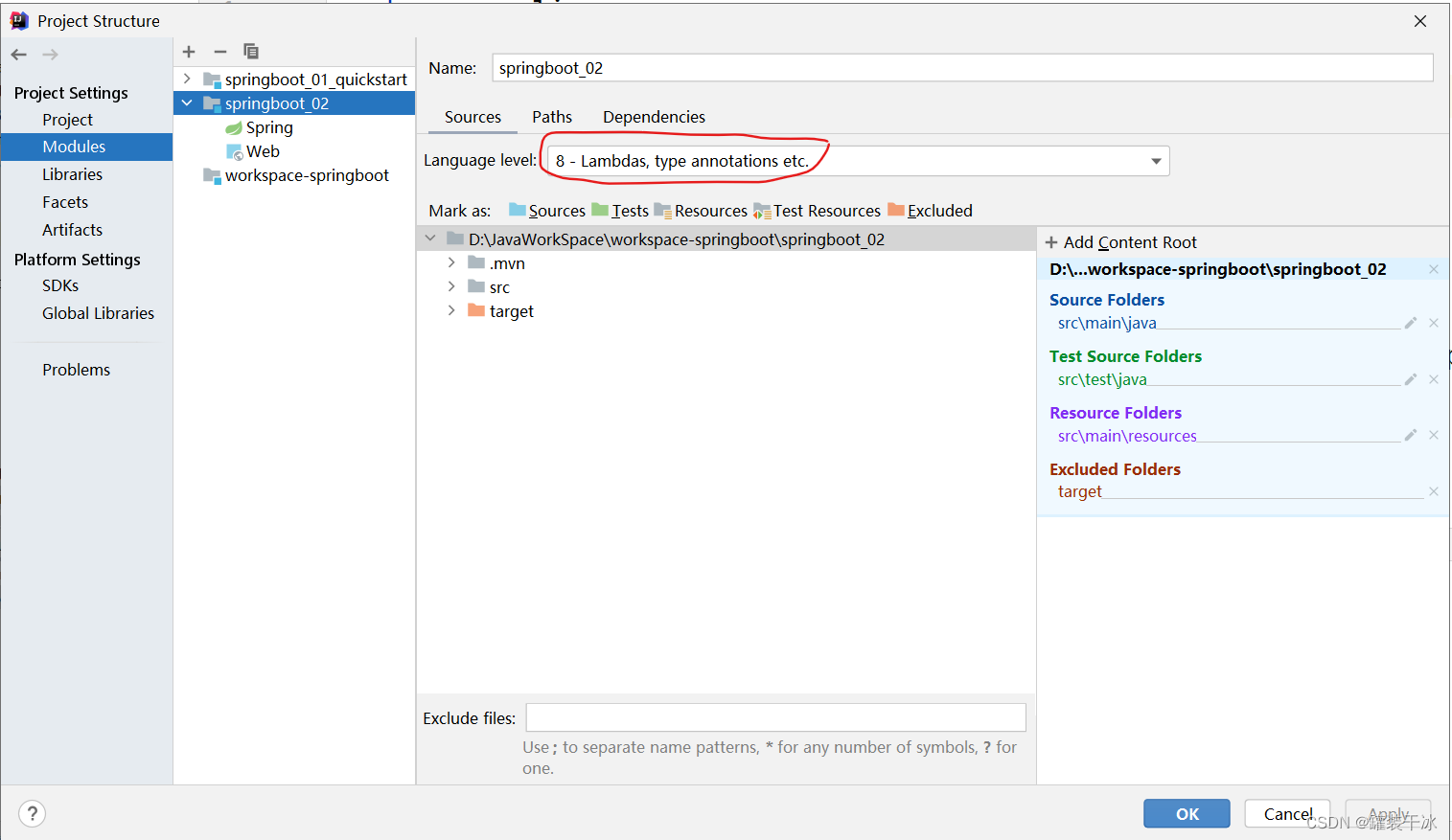 进入Modules,查看该项目Sources下的Language level是否与jdk版本匹配