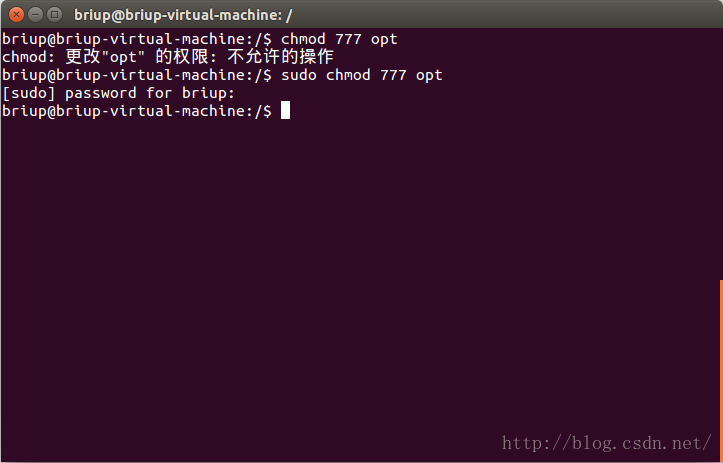将桌面上的jdk压缩包复制到opt目录下,此时你会发现无法完成复制,因为你没有操作opt目录的权限,我们打开终端修改opt的权限,进入根目录:cd / 使用ls会在显示的目录和文件中找到opt这个目录,使用sudo chmod 777 opt更改opt的权限。777表示最高权限。更改权限需要管理员权限,所以我们使用sudo执行操作,否则会报错
