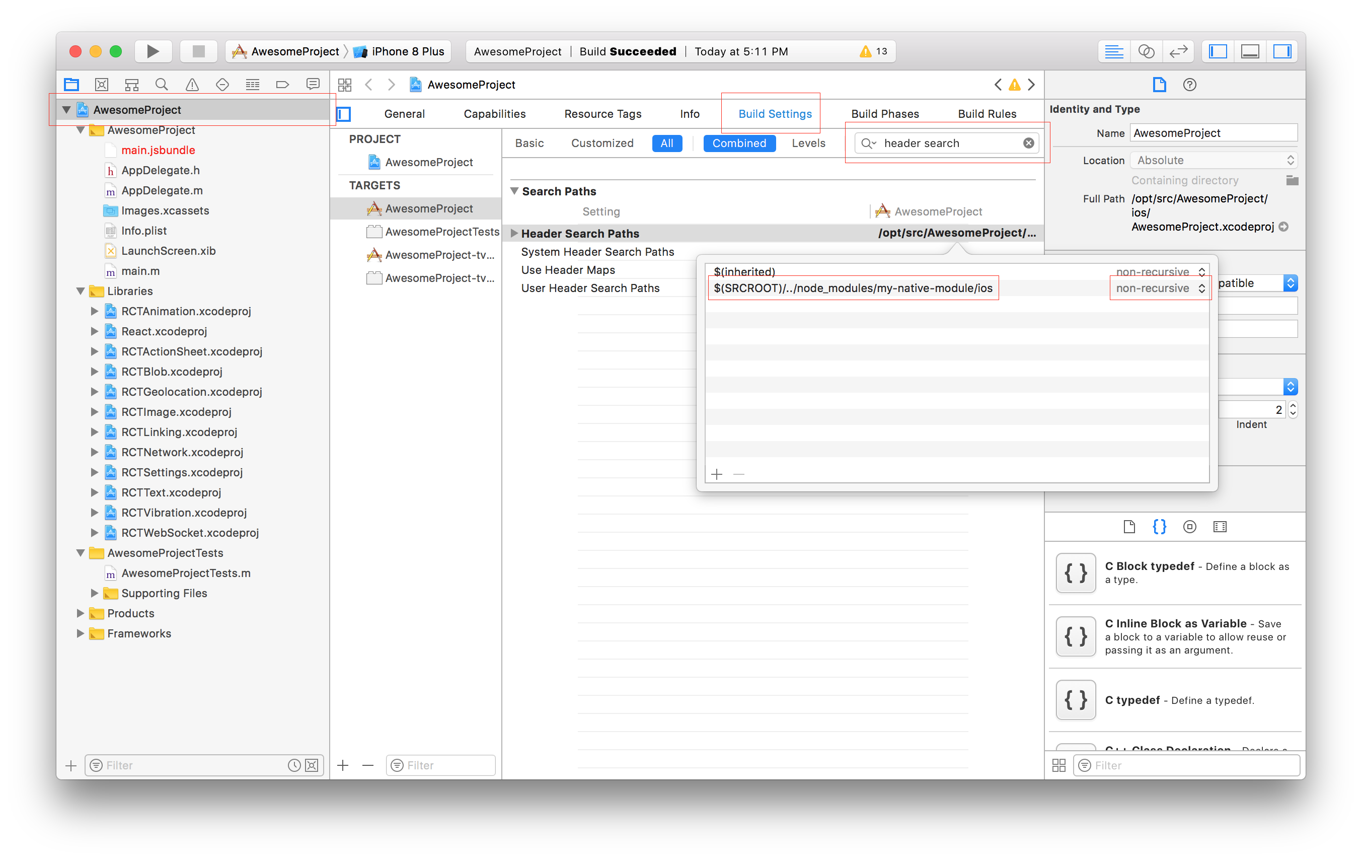 这种情况下我们需要能够访问到库的头文件。为了能够顺利打包,你需要打开你的工程文件,选择Build Settings,然后搜索Header Search Paths,然后添加库所在的目录。