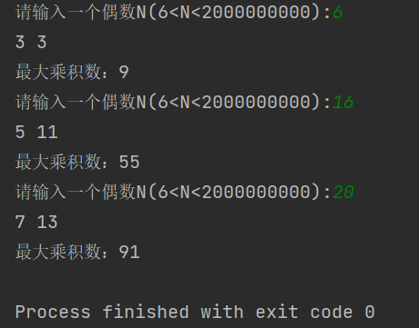 你需要输出两个奇素数,它们的和等于输入中的那个偶数,如果有多种选择,输出乘积