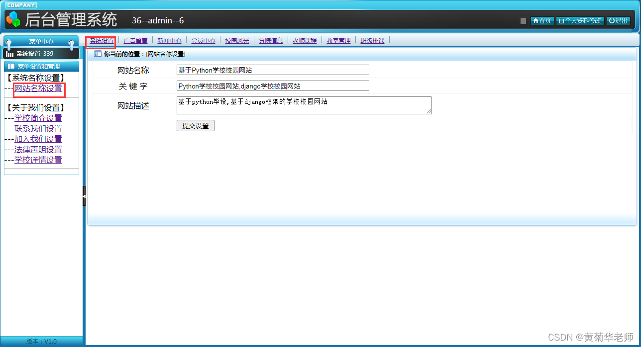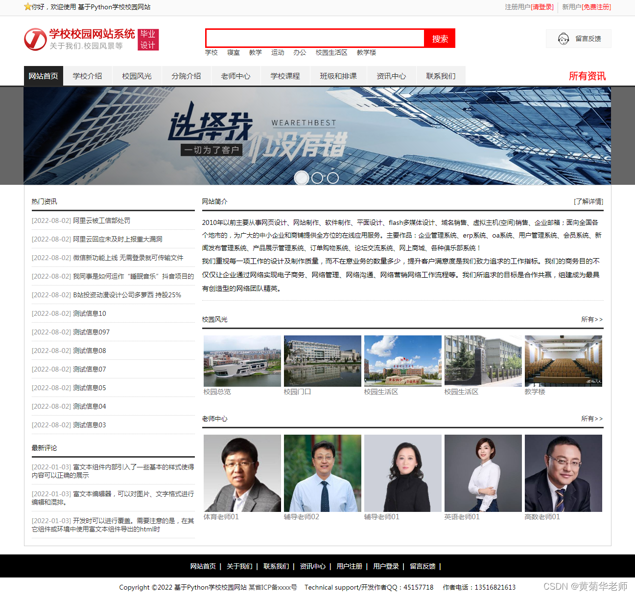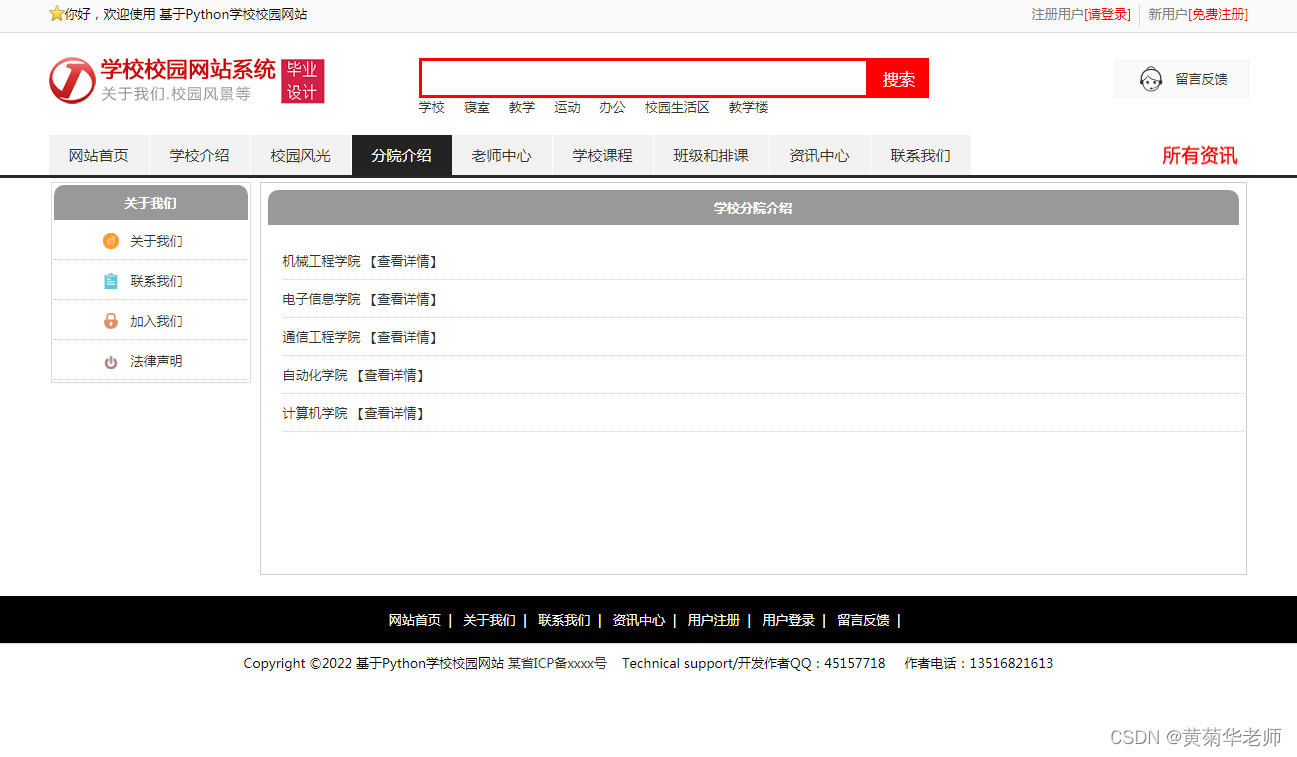 目的:本课题主要目标是设计并能够实现一个基于python的校园网站,整体网站系统基于B/S架构,技术上使用基于python的Django框架来实现;通过后台添加设置校园信息、录入和管理校园资讯、校园风光、学校分院信息、老师信息、课程信息、教学楼和教室信息、班级和班级排课信息等;广告师生通过登陆网站地址,了解校园信息、校园风光、查看资讯、资讯收藏、资讯评论、查看学校分院信息、老师信息、课程信息、班级和排课信息、给管理员留言等。