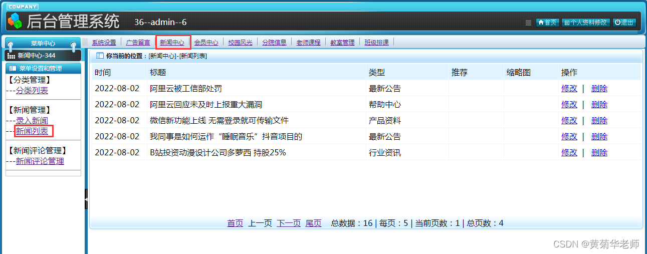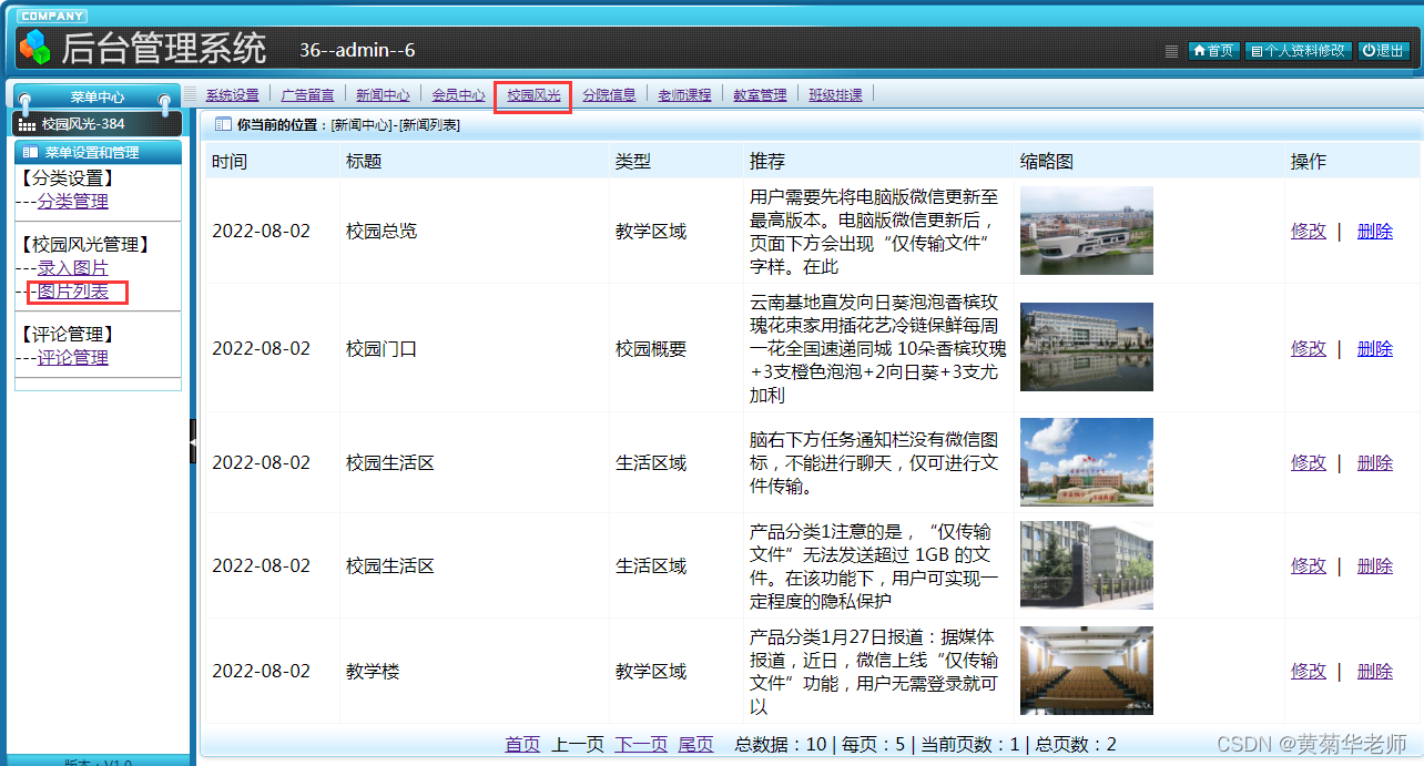 校园风光分类:录入、修改、查看、删除校园风光分类