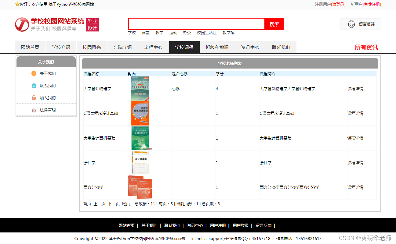 学校课程:列出学校所开设所有课程,点击课程详情可以查看课程