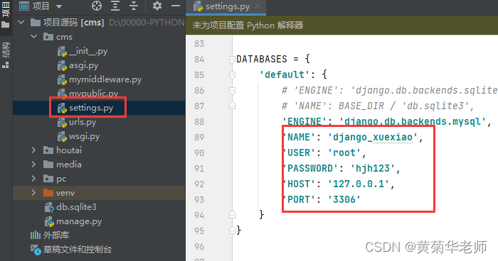 Cms/settings.py 设置数据库和账号,大约在代码第90行左右