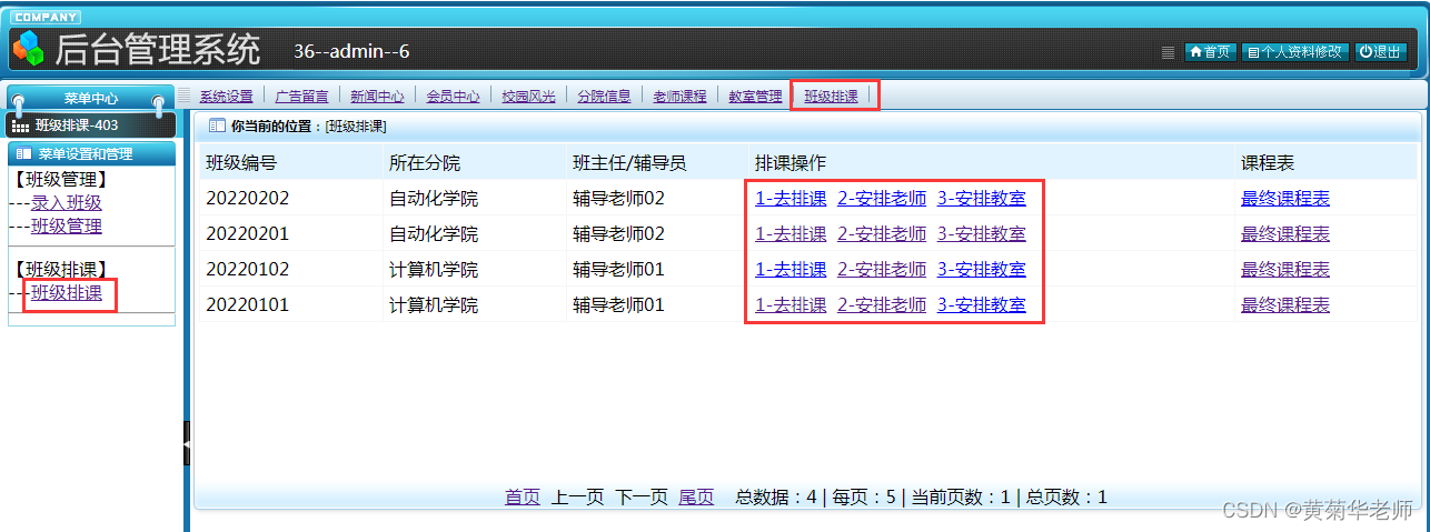 班级排课:每个班级信息右侧,可以点击最终课程表,查看排课信息