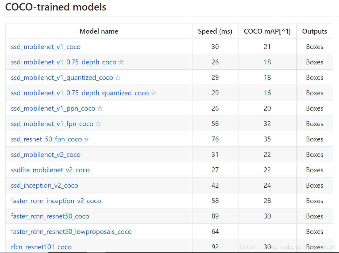 1、train_config中的fine_tune_checkpoint:用于指出已有模型的路径。Google提供的已有模型可以在model zoo里找到并下载,部分model的性能列表如下。这里我们选择速度快、准确率相对偏低的ssd_mobilenet_v1_coco。之后的from_detection_checkpoint用于选择是基于分类的模型还是识别的模型,一般都设为True,选择效果更好的识别的模型。