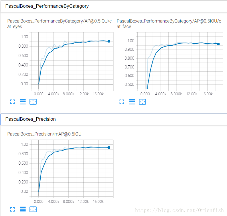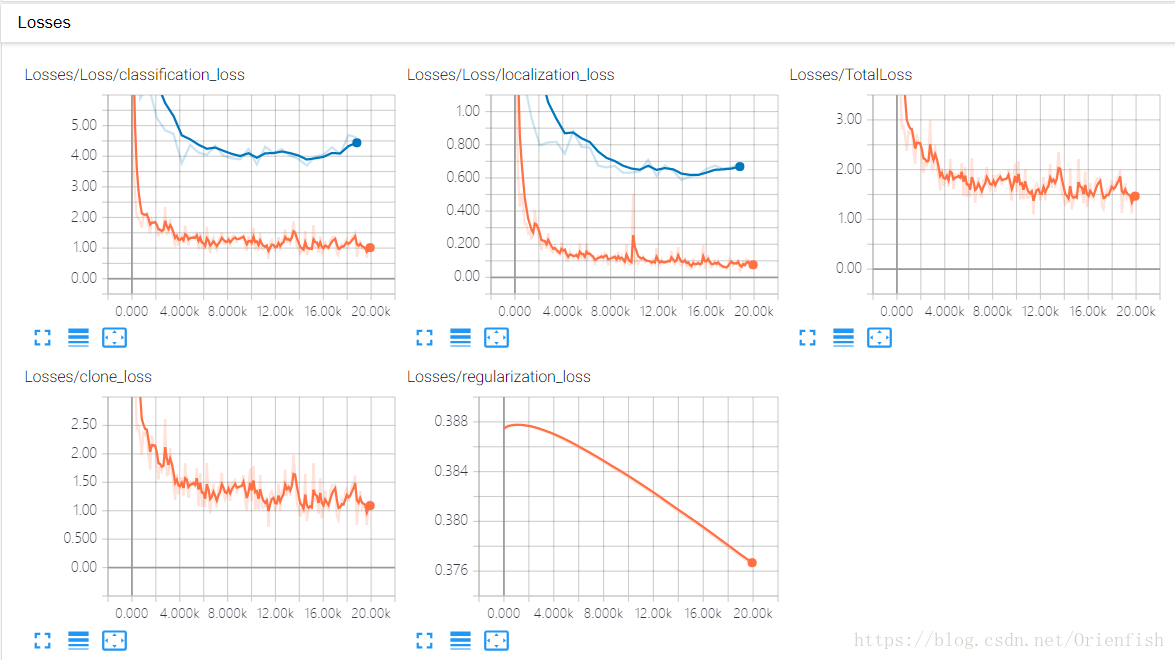 tensorboard上记录的训练曲线如下所示,橙色是训练的曲线,蓝色是测试的曲线。