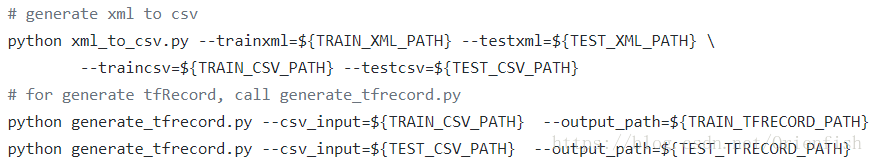 完成了这一步之后,通过[1]中给出的xml_to_csv.py和generate_tfrecord.py将.xml转成.csv最终转成tfrecord文件方便输入Tensorflow搭建的框架。(突然有一个问题,为什么一定是.xml格式,为什么中间一定要有一个.csv格式过渡,为什么一定要用tfrecord格式输入Tensorflow?)这部分功能可以通过以下语句实现:
