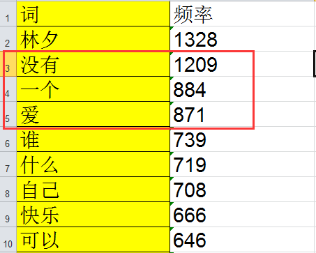 程序我是用Java语言写的,其中核心的部分就是分词,也是一个小难点,再统计一下每个元素(每个词)出现的频率,将结果输出到Excel中,再作出分析图。 上网搜了一下,不看不知道,着实吓了我一跳,林夕填过的歌词竟然有2500多首,合起来有60多万字(我连写800字的作文都困难⊙﹏⊙b汗)!注意,这里每首歌歌词都是是不含第二节部分!