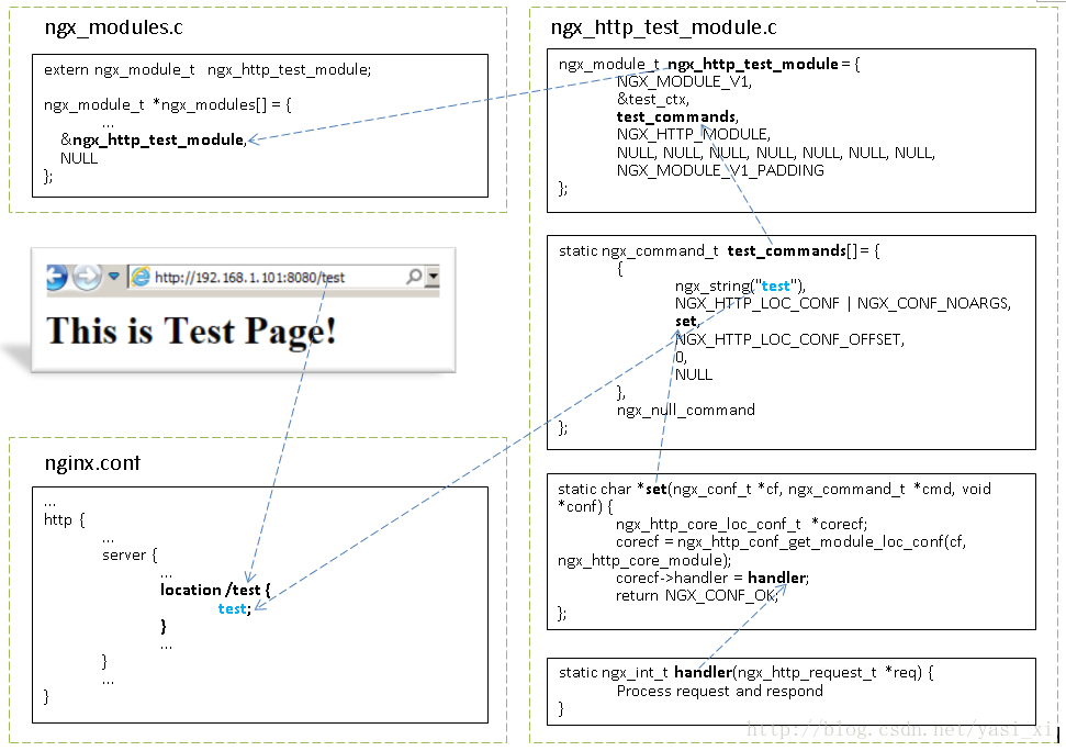 结构体第一个参数尤为重要, 这里是test, 指的是我们在配置文件中输入test(不是路径的/test).这样指定后, nginx在读取配置的时候读到test命令, 才会把接管权给我们.也就是把请求转给我们去处理.