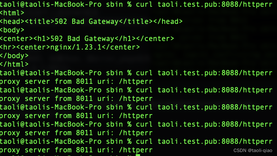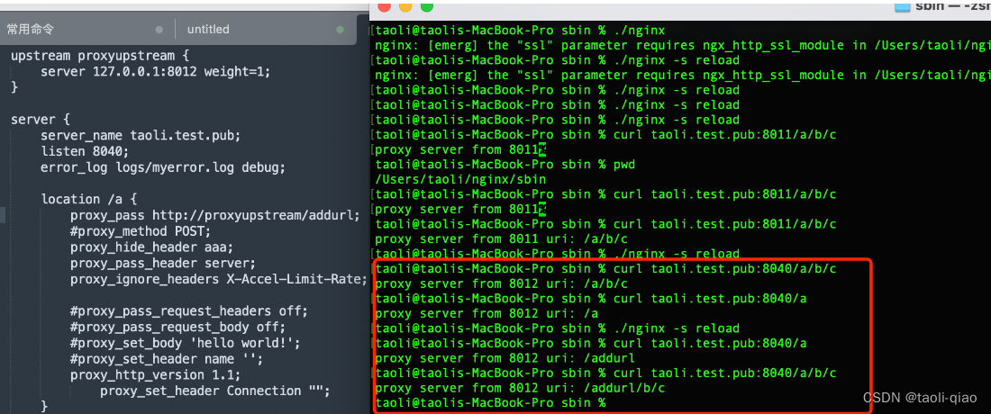 2.2当URL参数中不携带URI,nginx将客户端转发的URI直接转发给上游。实验结果如下图所示,proxy_pass中无“/addurl”时,原样转发客户端发送的URI,当proxy_pass中有"/addurl"时,用curl命令"curl taoli.test.pub:8040/a/b/c"时,/a被替换成了/addurl