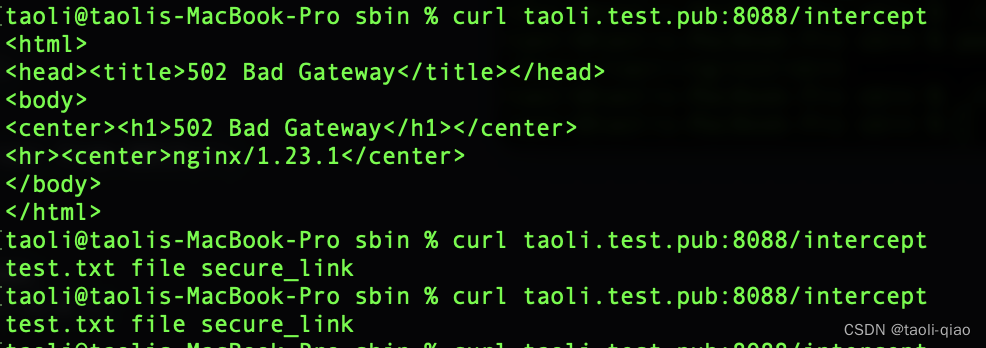 下面的左边是访问/httperror的结果,刷新配置后,首次访问会返回502,后面都会把请求转发到正常的服务上,即8011端口的服务上。右边是访问/intercept的结果,当8013端口的服务处于完全无法连接的情况时,访问返回502的错误码,但是当8013端口的服务能连接,但是服务返回300以上的状态码时,按error_page进行处理,这里error_page是显示nginx/html/test.txt文件内容。