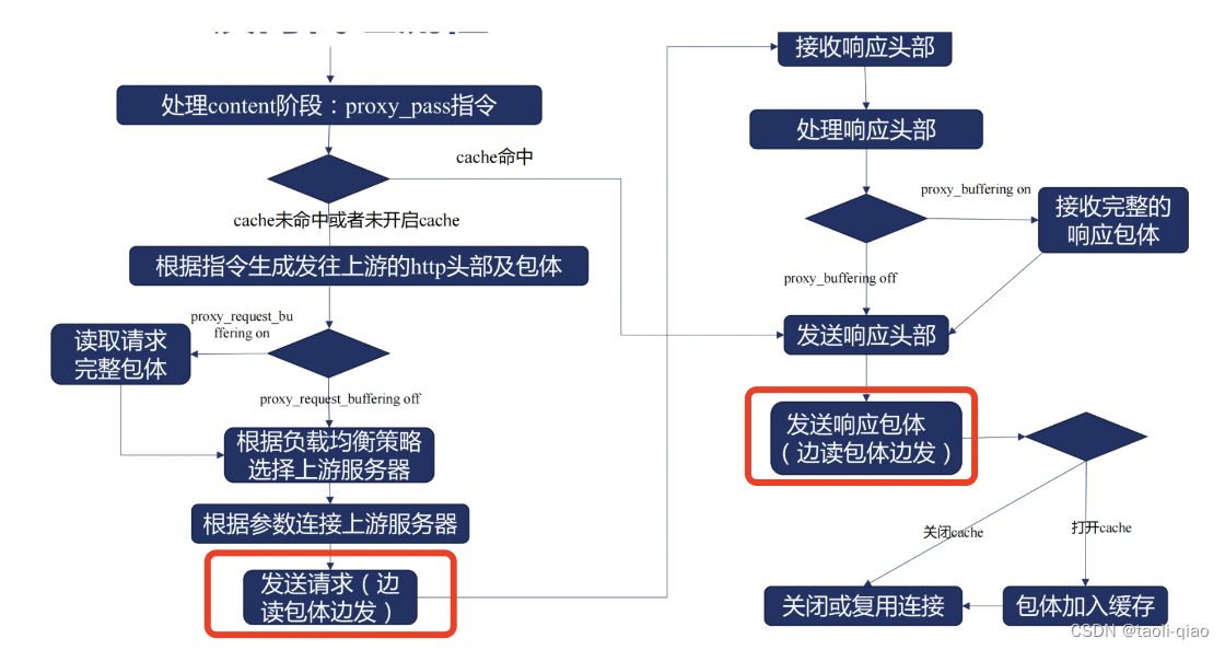 在读取客户端发送的请求时,如果proxy_request_bufferring=on,那么读取完整的包体后再发送给后端服务,如果 proxy_request_bufferring=off,则是边读取包体,边发送。在服务端返回请求响应的包体时,通过proxy_bufferring=on/off来控制接收完整响应包体或是边发送边读取。下面的内容将围绕反向代理的过程来展开,介绍处理过程中涉及的指令、配置项等。