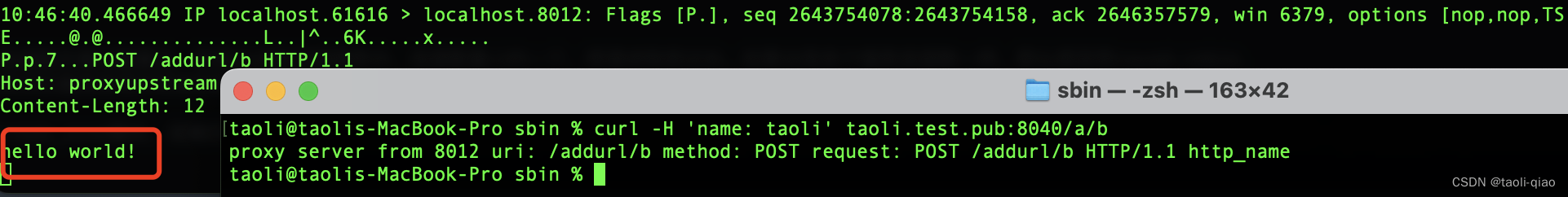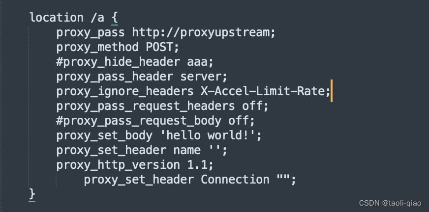下图是proxy的一些配置,使用proxy_set_body设置转发请求的body值,当用curl命令访问nginx时,可以使用tcpdump命令查看发送的body内容,可以看到和设置的内容(hello world)一致。