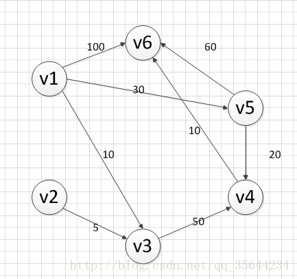例如这幅图,按照Dijkstra的算法,起始点为v1,先将dis[1]=0,dis[2]=无穷,dis[3]=无穷,dis[4]=无穷,dis[5]=无穷,dis[6]=无穷。然后从v1出发,有v3,v6,更新dis[3]=10,dis[6]=100,dis[5]=30,然后,将v1的flag值置成1,代表已经使用过,然后寻找最小的dis[i],发现是dis[3],从3出发,可以更新dis[4]=min(无穷,dis[3]+dist[3][4])=60,同理可以更新剩余的点,直到每一个点都已经选取过为止。