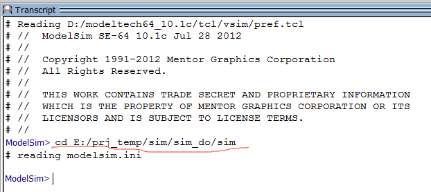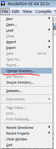 最后打开modelsim,在File/Change Directory下指定仿真工程的文件夹位置,如x:/sim_add/sim下即可。