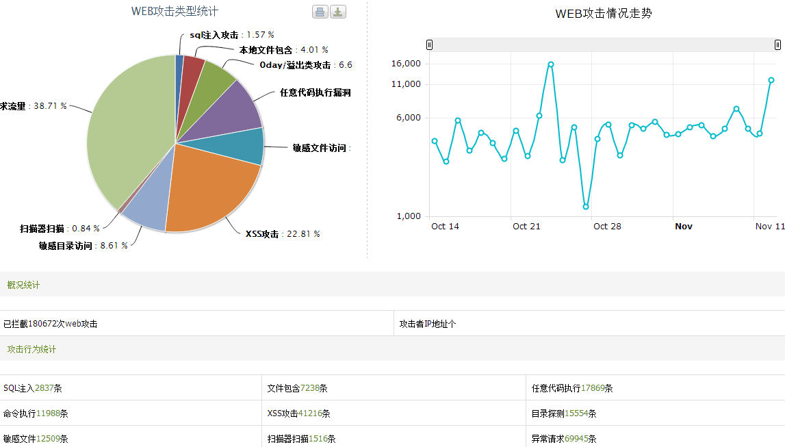 那你说可以用Nginx + Lua编写了一个WAF,然后把相关的日志记录到了Elasticsearch中,通过kibana可以图形化的展示不同的攻击类型的统计。