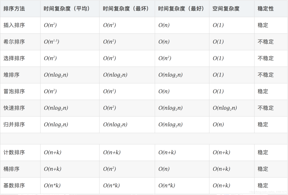 1)当n较大,则应采用时间复杂度为O(nlog2n)的排序方法:快速排序、堆排序或归并排序。