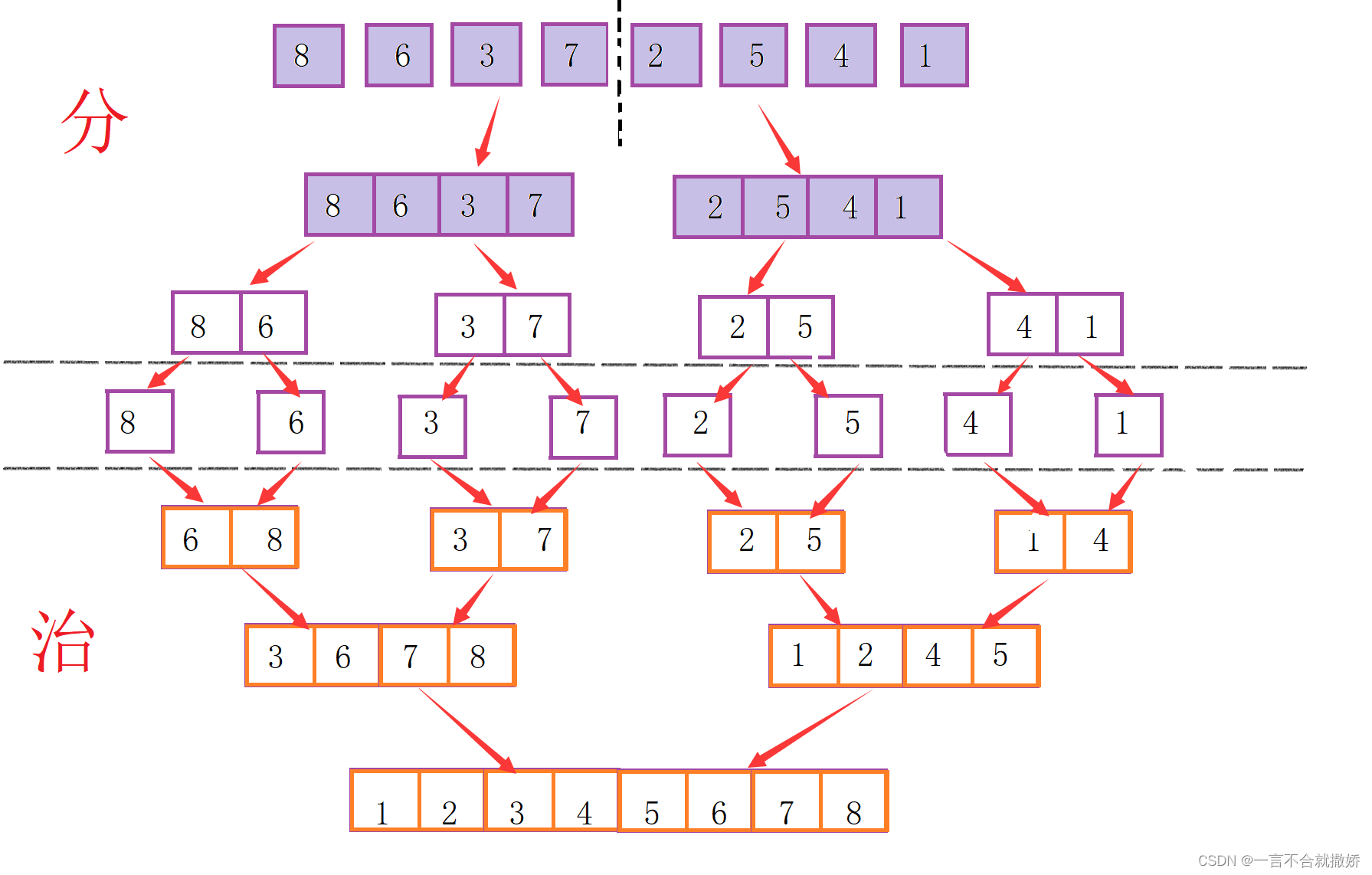 - 归并排序核心思想是先分再治,具体算法描述如下: