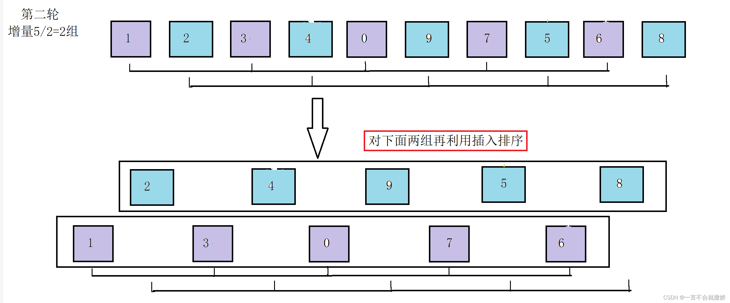 - 根据已分好的组进行插入排序(每组排序,根据对应的增量k来找到当前的元素)