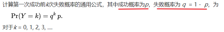 几何分布是伯努利分布的推广,不断重复伯努利试验,直到首次成功为止,随机变量 X X X表示首次成功时已经完成的试验次数,我们称 X X X 是一个服从几何分布的随机变量