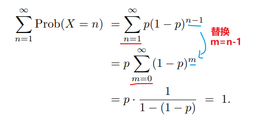 E [ X ] = 1 ⋅ p + E [ X + 1 ] ( 1 − p ) p E [ X ] = 1 μ X = E [ X ] = 1 p E[X]=1cdot p+E[X+1](1-p)\ ~\ pE[X]=1\ ~\ mu_X=E[X]=frac{1}{p} E[X]=1⋅p+E[X+1](1−p) pE[X]=1 μX=E[X]=p1