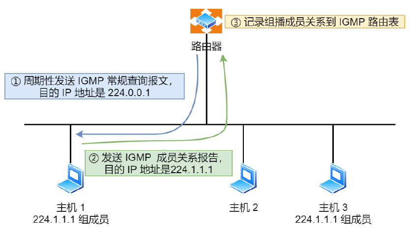 - 主机1 和 主机 3 收到这个查询,随后会启动「报告延迟计时器」,计时器的时间是随机的,通常是 0~10 秒,计时器超时后主机就会发送 IGMP 成员关系报告报文(源 IP 地址为自己主机的 IP地址,目的 IP 地址为组播地址)。如果在定时器超时之前,收到同一个组内的其他主机发送的成员关系报告报文,则自己不再发送,这样可以减少网络中多余的 IGMP 报文数量。