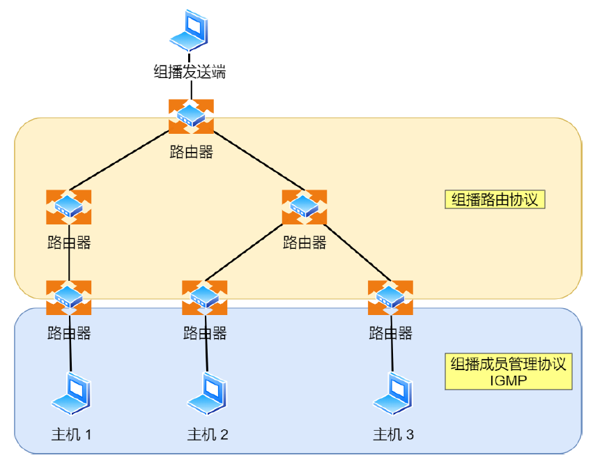 IGMP 是因特网组管理协议,工作在主机(组播成员)和最后一跳路由之间,如上图中的蓝色部分。