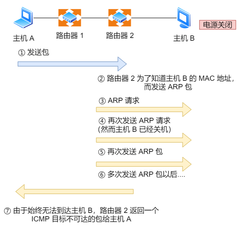 如上图例子,主机 A 向主机 B 发送了数据包,由于某种原因,途中的路由器 2 未能发现主机B 的存在,这时,路由器 2 就会向主机 A 发送一个 ICMP 目标不可达数据包,说明发往主机B 的包未能成功。ICMP 的这种通知消息会使用 IP 进行发送 。因此,从路由器 2 返回的 ICMP 包会按照往常的路由控制先经过路由器 1 再转发给主机 A 。收到该 ICMP 包的主机 A 则分解 ICMP 的首部和数据域以后得知具体发生问题的原因。