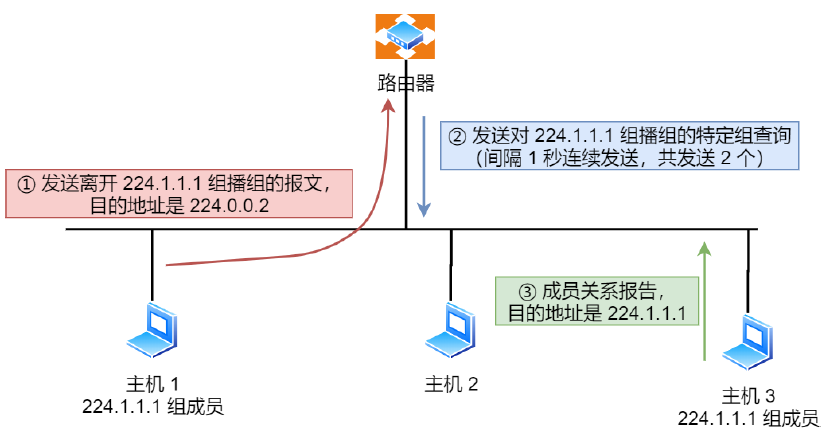 - 主机 3 仍然是组 224.1.1.1 的成员,因此它立即响应这个特定组查询。路由器知道该网络中仍然存在该组播组的成员,于是继续向该网络转发 224.1.1.1 的组播数据包。