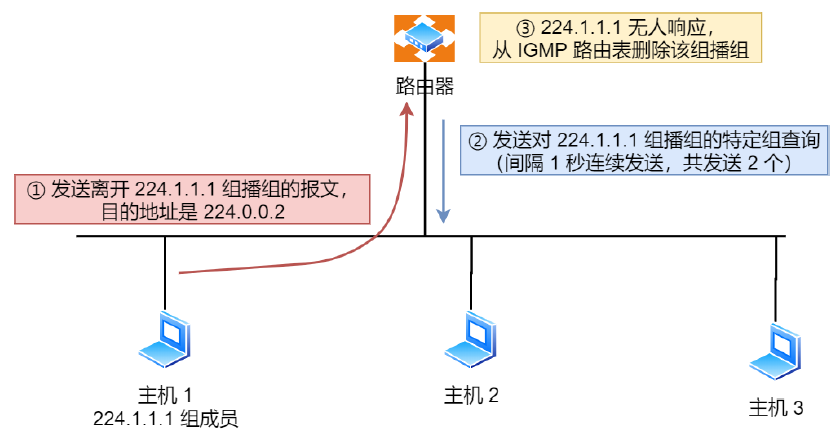 - 主机 1 要离开组播组 224.1.1.1,发送 IGMP 离组报文。