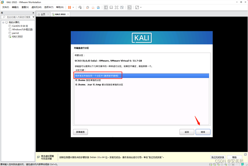 13、选择分区方案(新手推荐第一个、“将所有文件放在同一个分区中”)