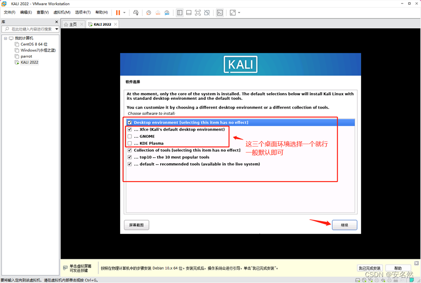 16、首选Xfce桌面环境(Xface、GNOME、KDE桌面环境选一个即可),无“...”表示主菜单,“...”表示对应的子菜单。其他默认即可