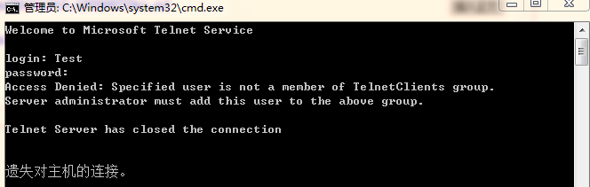 然后创建TelnetClients组(在创建此组时,突然发现对windows很不了解,搞了很久)命令行lusrmgr.msc,弹出本地用户和组管理界面,打开组,找是否存在TelnetClients组,如果么有,那么创建一个组。创建完之后,将Test用户加入到此组中,右击属性,点添加,输入Test,点击确定。