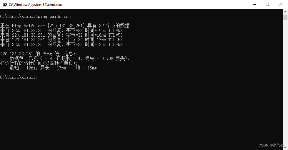 - Ping -t baidu.com——不间断的向目标地址发送数据包,按下Ctrl+C终止发送,按下Ctrl+Break